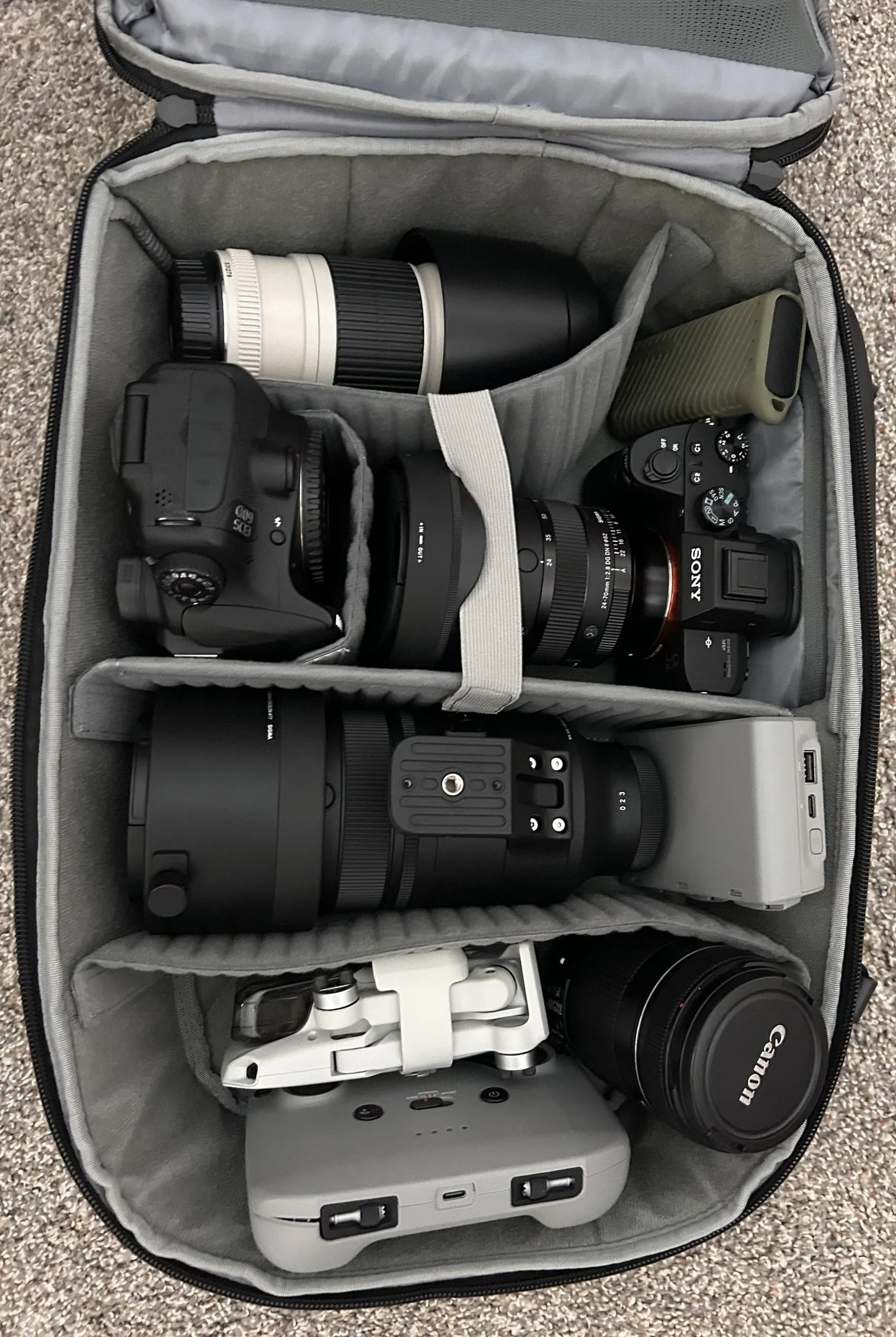 A Cam: I have a Sony A7iii body with a battery grip, for lenses, I have a Sigma 24-70mm f/2.8 DG DN Art ii, and a Sigma 70-200mm f/2.8 DG DN OS Sports lens.